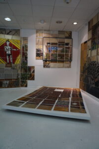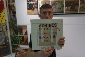 You may notice that some sections of the bookcase have been replaced by printed squares. This is where I have sold individual pieces. I would repaint the same space however it appeared when I revisited it at the later time (until 2022). Around 50 of the squares were repainted after I sold them, (originals in model behind door). Some many times over. The best seller? The Vespa card on the bookcase that my mum made. This is the fourth version of that square. All three of the buyers are here tonight. Continuity is a wonderful yardstick.