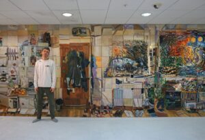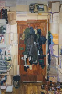 This is a show of two halves: on your right as you walk in is the original series made in 2018 including the sofa and the bookcase (Ascetic). Along the long wall on the left, are the paintings I did in 2025 – the kitchen, front door and hi-fi (Aesthetic).